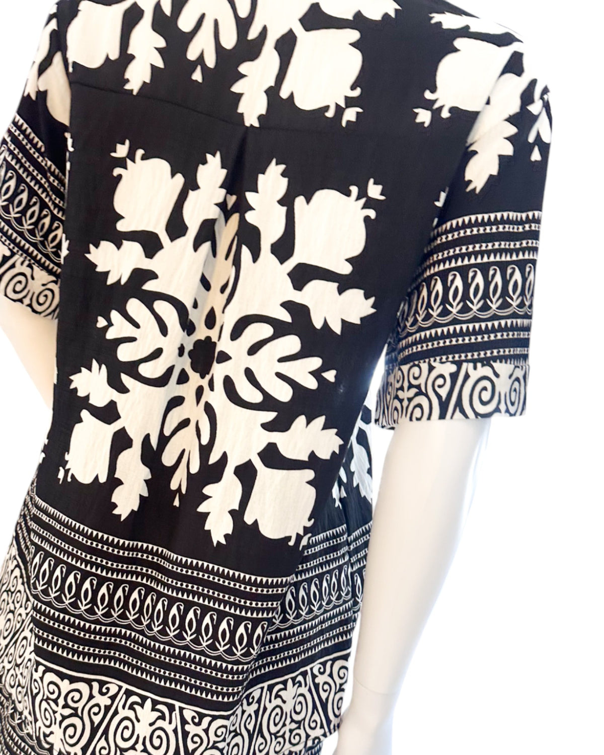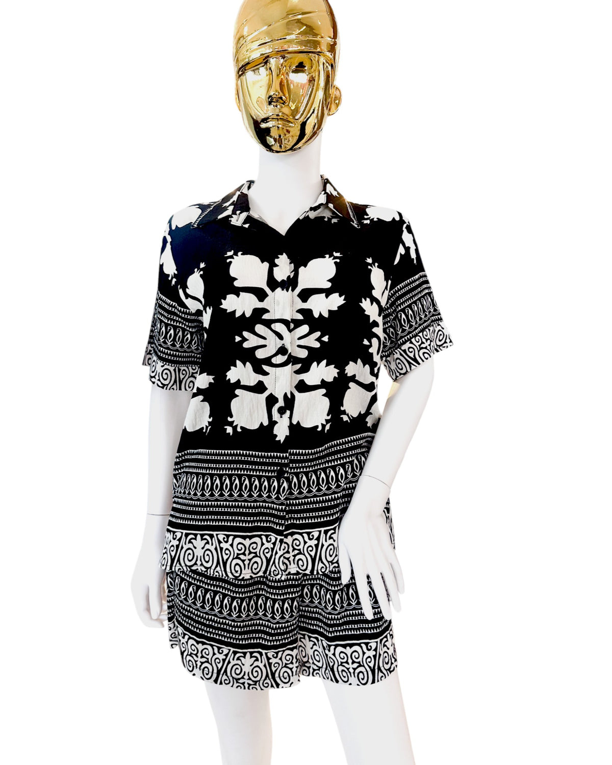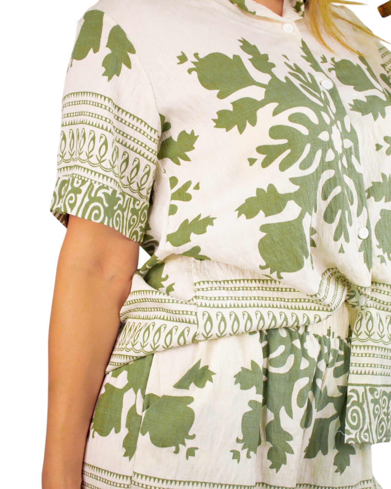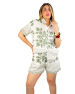 ¡Descubre la comodidad y la elegancia del Set Mar! Hecho de tela fresca tipo lino en tonos verde, azul y negro, con short elástico y blusa de botones con estampado único. Ideal para lucir con estilo en cualquier ocasión.