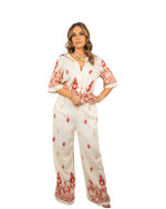 ¡Vístete a la moda con nuestro Set Mayan! Confeccionado en suave lino color crudo, cuenta con detalles bordados en tonos rojizos para un toque único.