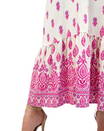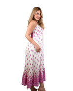 El Vestido Florentina rosa es un maxi blanco con un encantador estampado floral verde, perfecto para un look casual y fresco.