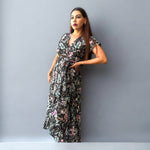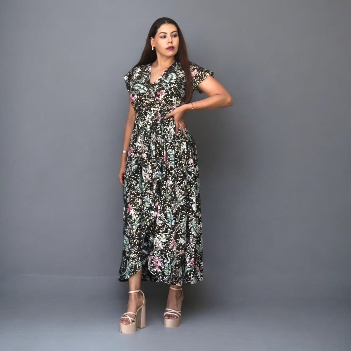¡Prepara para impresionar con nuestro vestido maxi negro con flores y toques dorados!