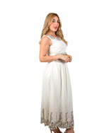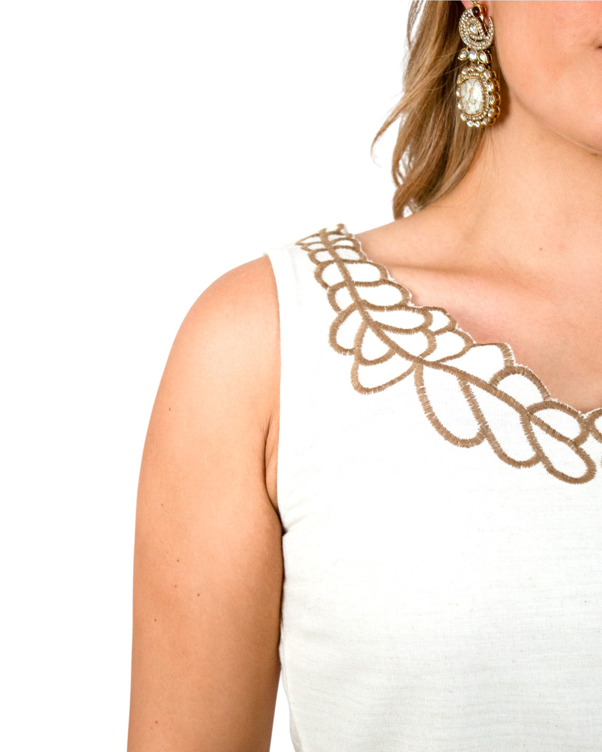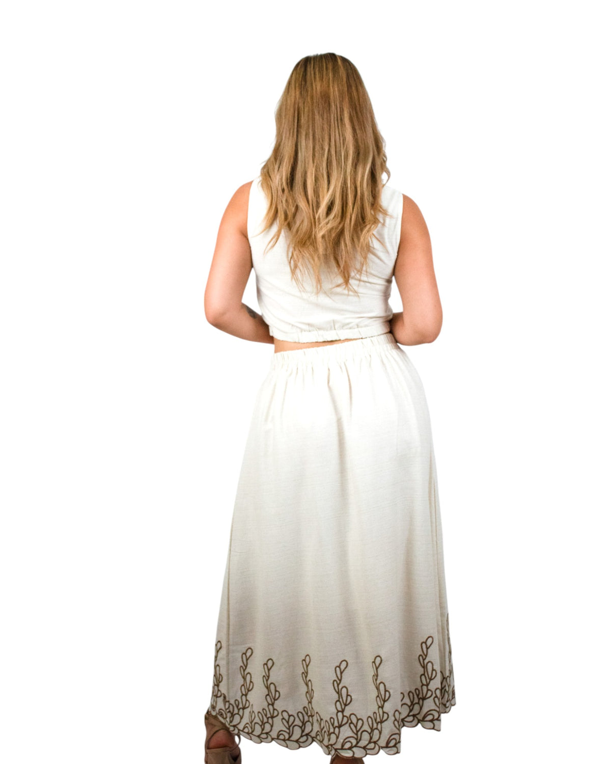 Disfruta la frescura y elegancia del Set Arianna, un conjunto de lino color hueso con delicados bordados en las orillas en tono café.