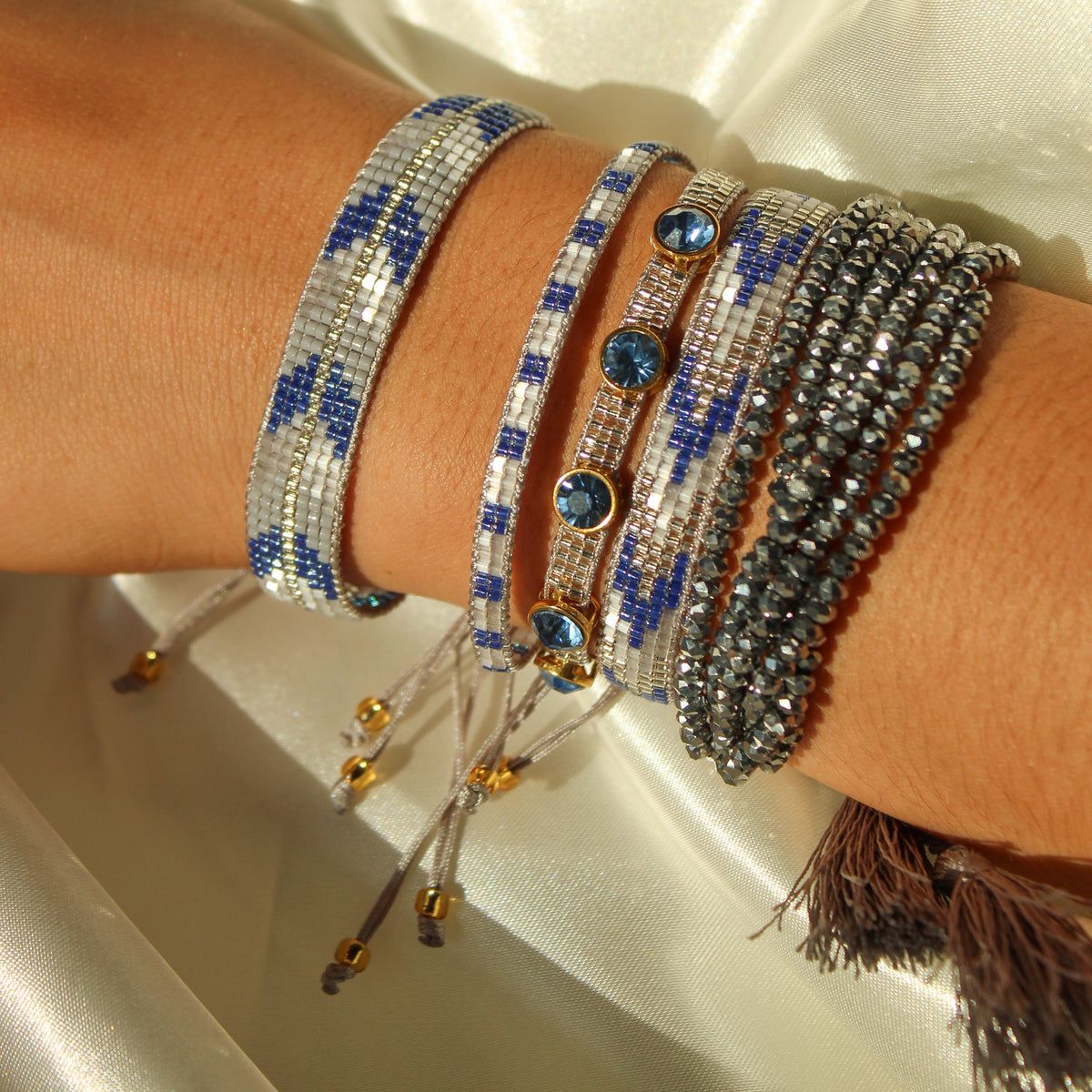 Set de nuestra colección  miyuki tejido a mano de cinco piezas en tonos gris y azul, uno multi plata, uno de cristales azul, dos tejidas.