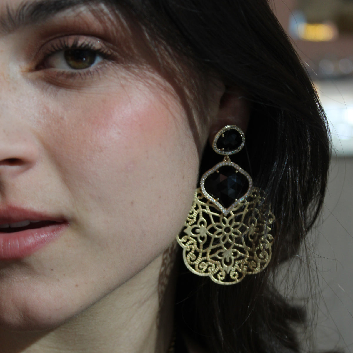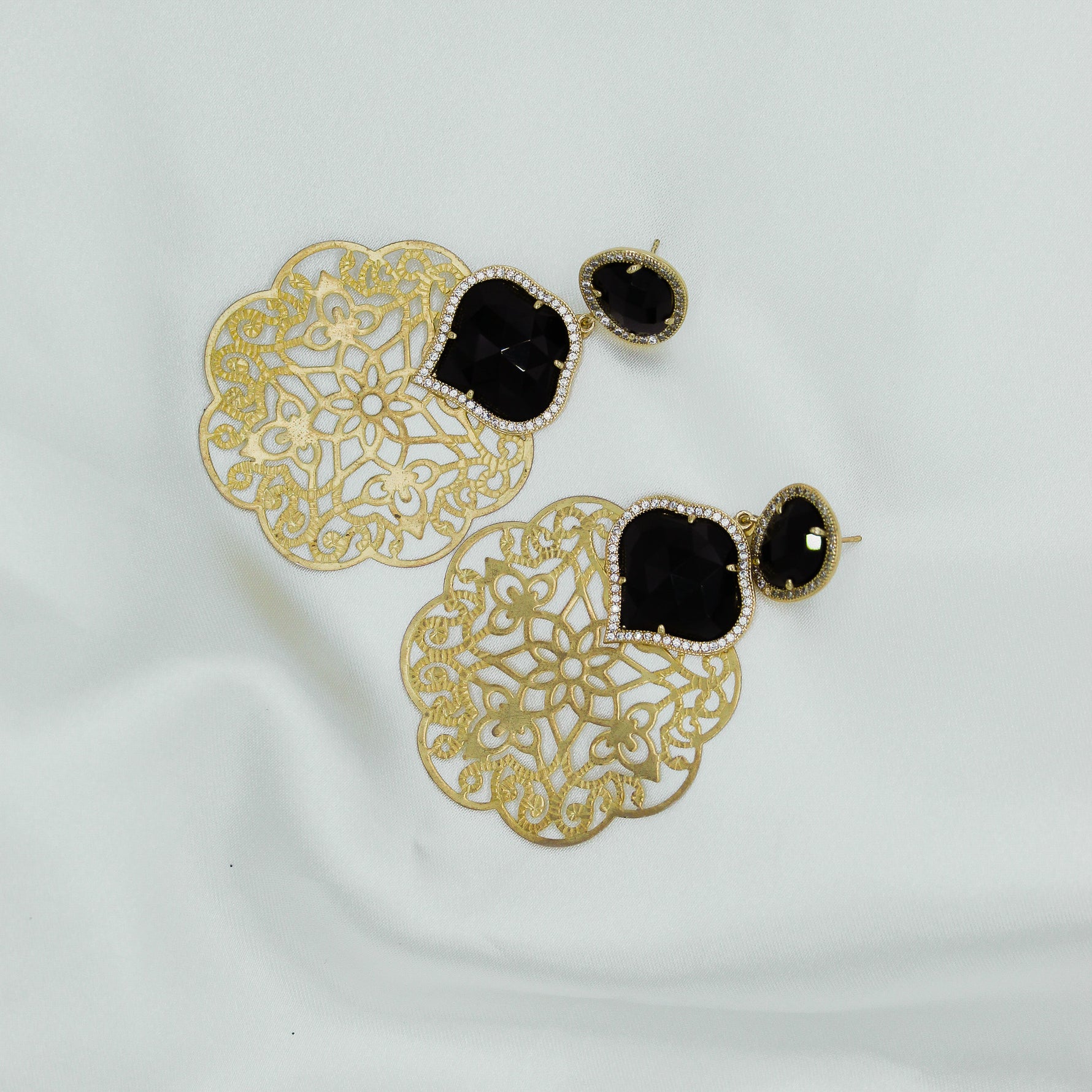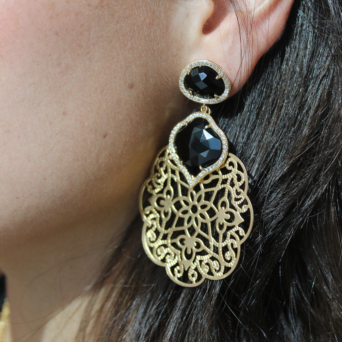 Aretes creados en Maria Santina de filigrana dorada con diseño de doble gota cristal negro .