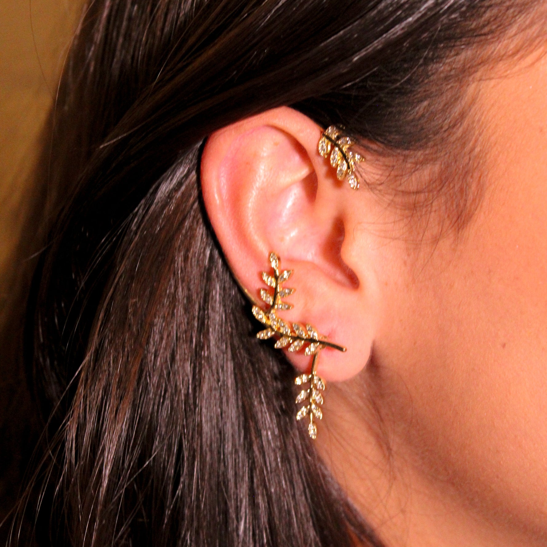 Arete de una sola orejita color dorado con detalle de hojitas brillantes.