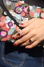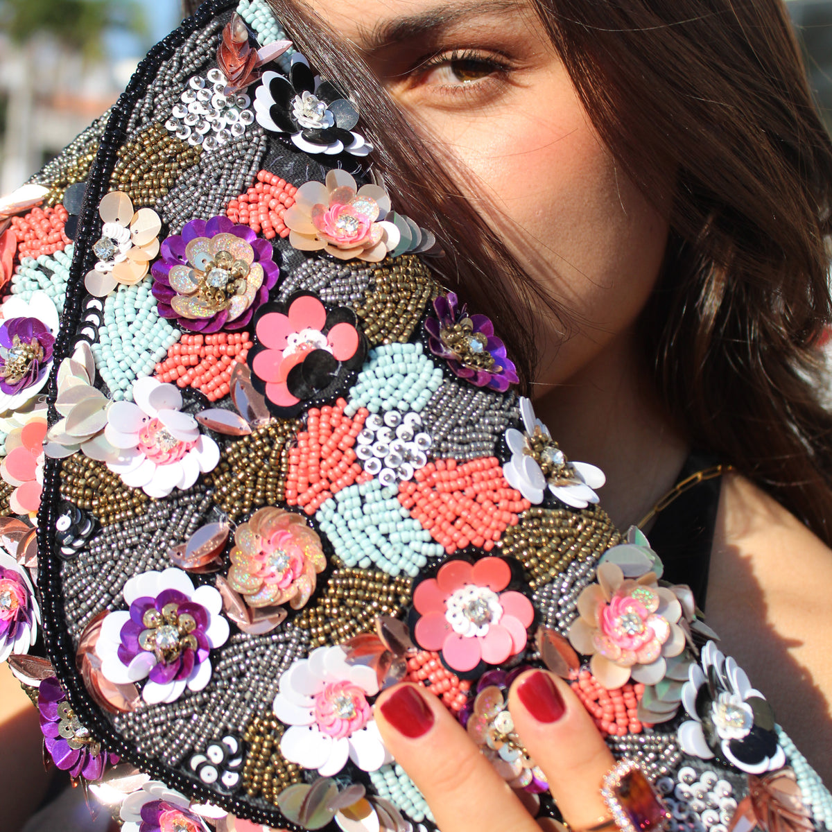 Comencemos la primavera con este hermoso bolso tipo clutch en sobre bordado a mano en chaquira y flores en tonos blanco/lila/rosa/menta con un toque de tonos dorados y plateados.