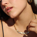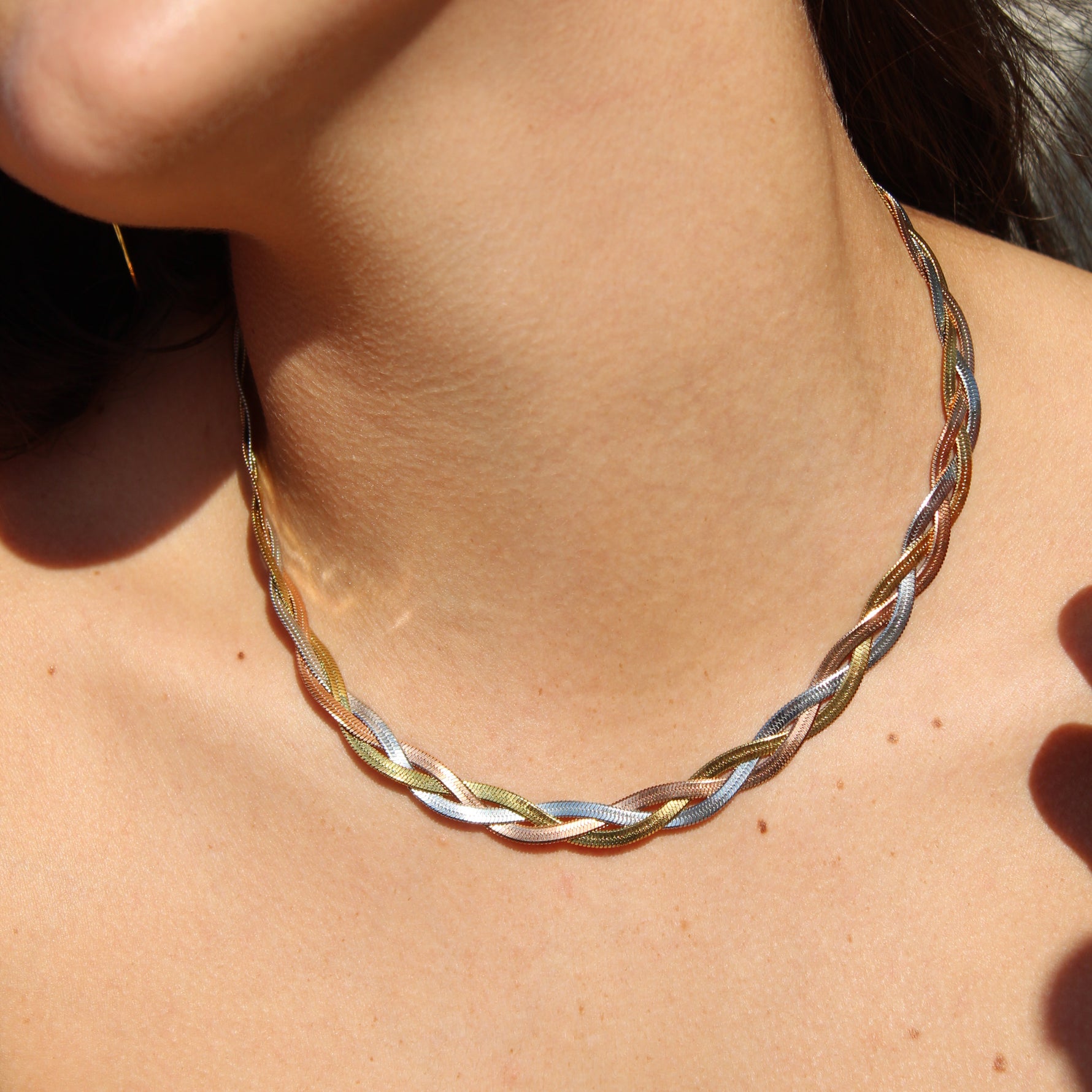 Cadena casual plana trenzada en acero inoxidable en tonos plata/dorado/ororosa.