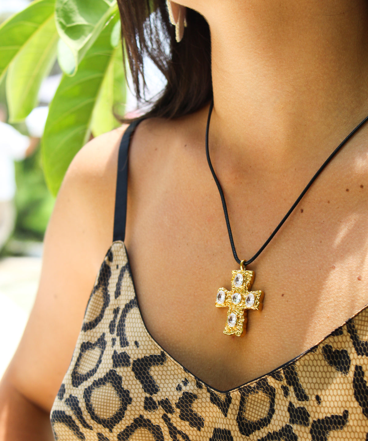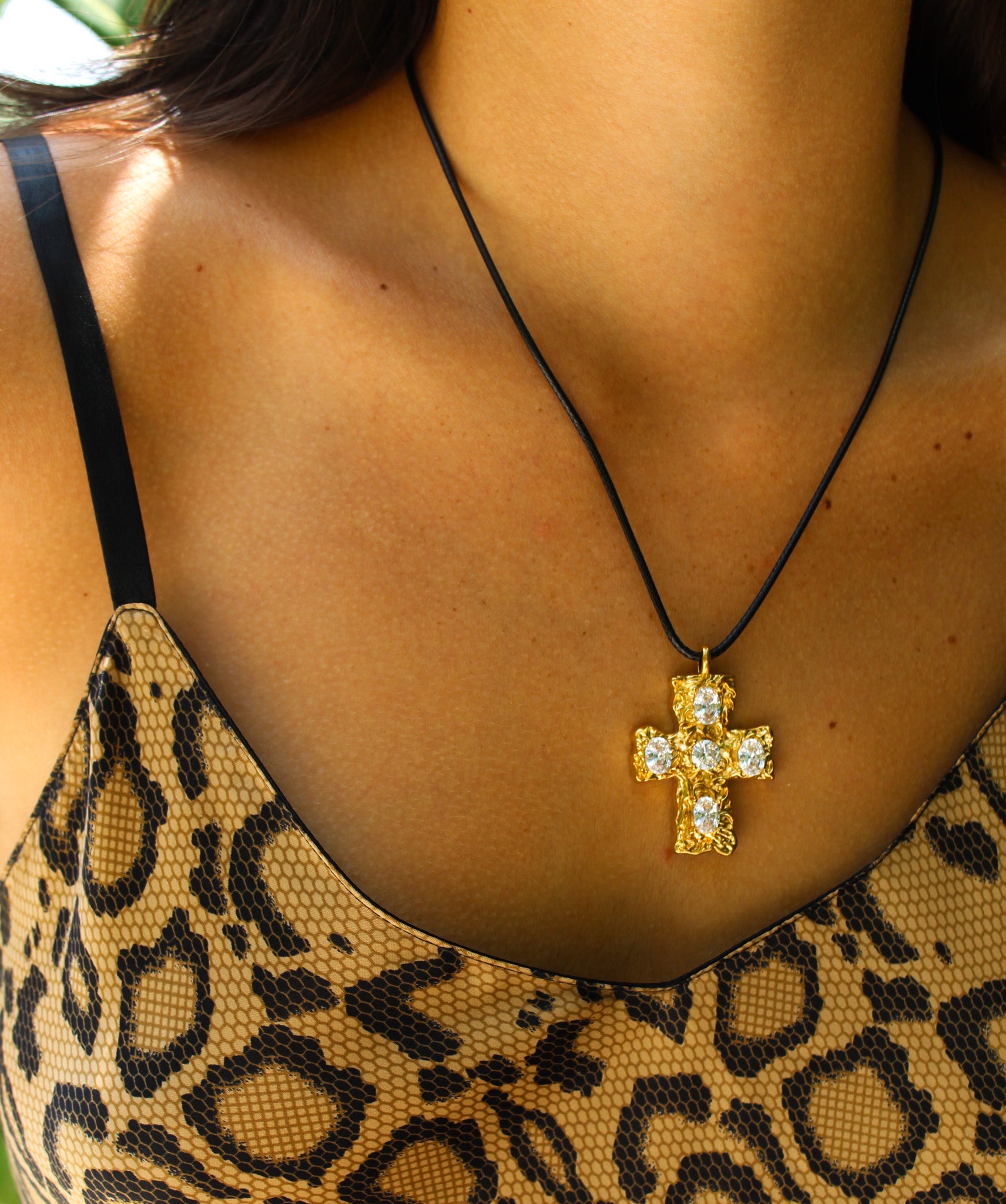Bonita cadena en tendencia de cordón negro con dije de cruz dorada y cristales plateados.