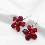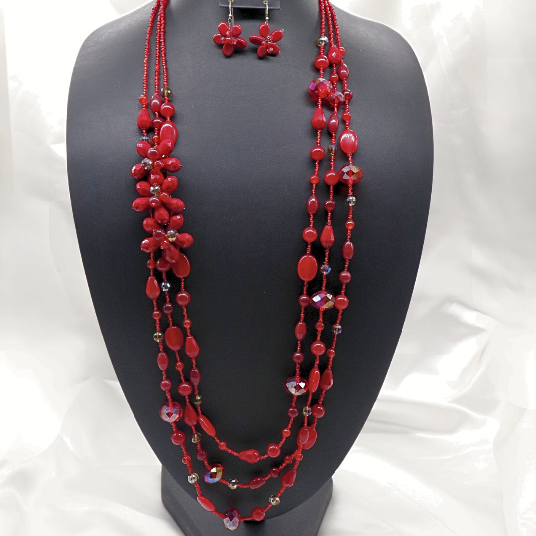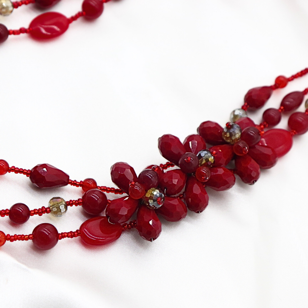 Collar ARIEL con tres hilos largos de chaquira y detalles de flores y cuentas de ágata y cristal color rojo .