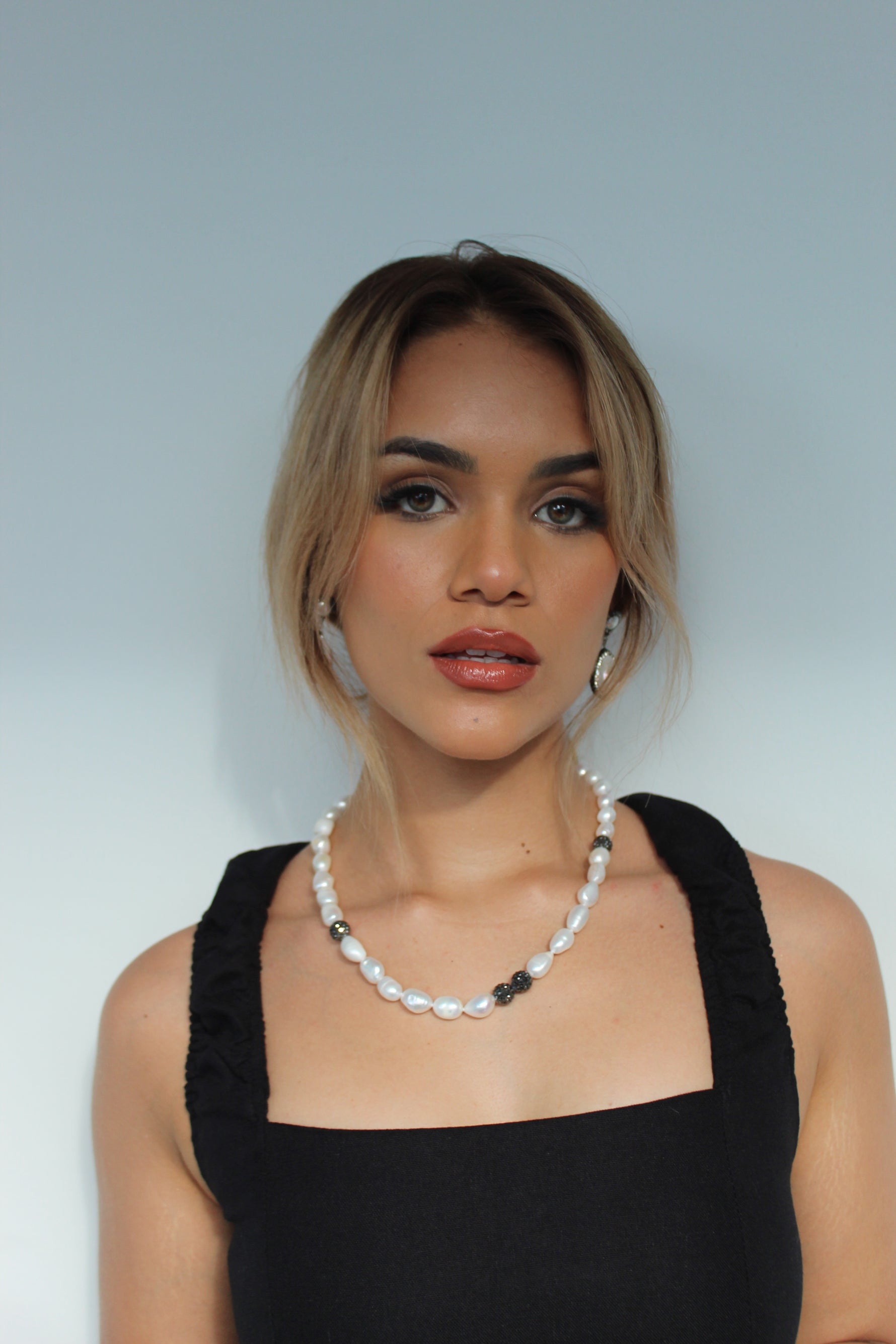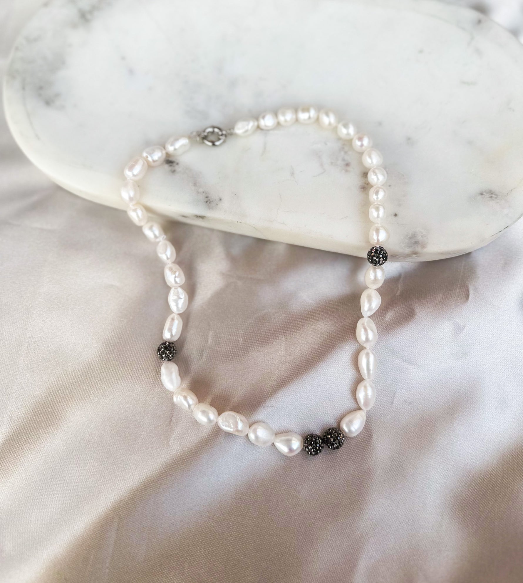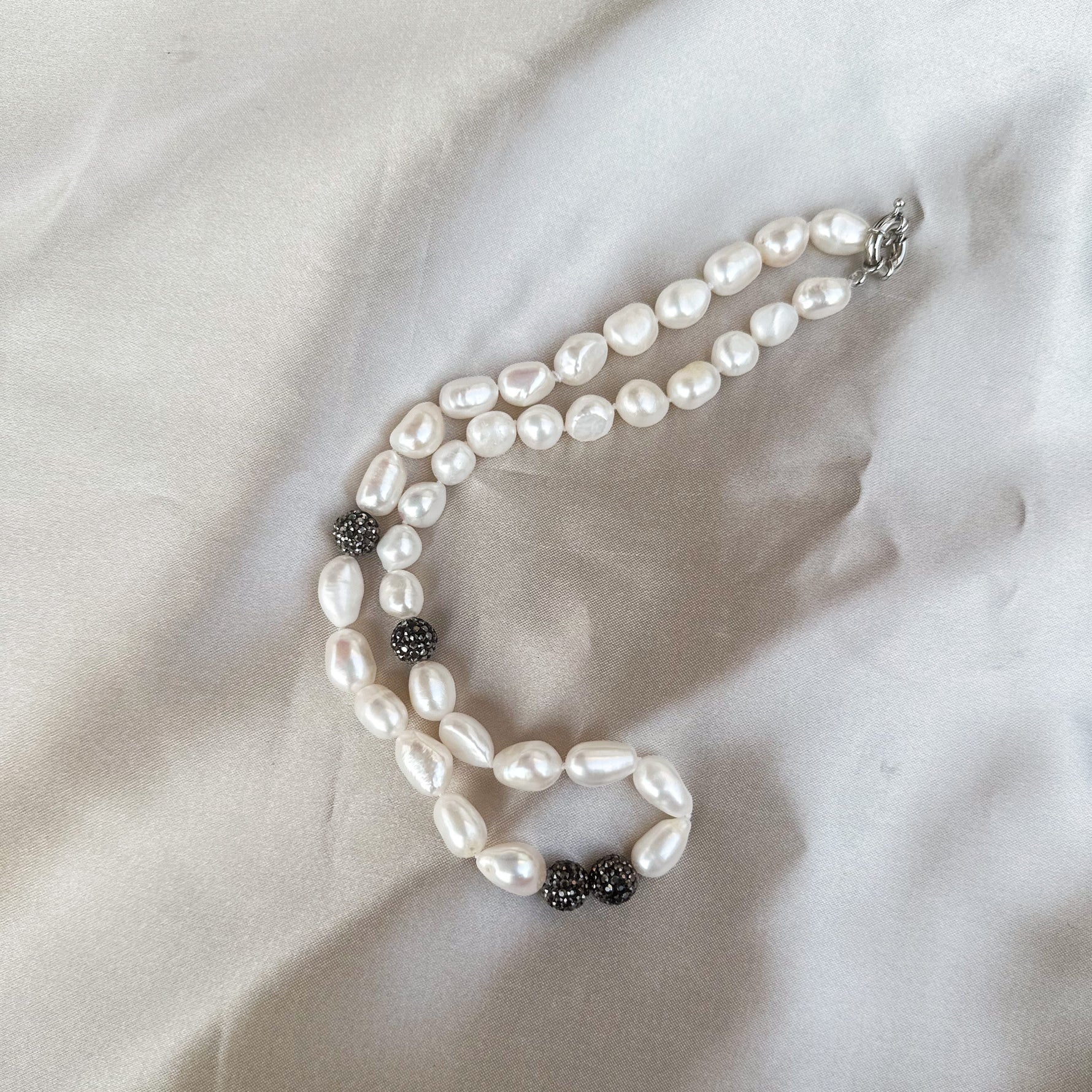 Haz que tu look sea único con nuestro collar de perlas naturales con detalles brillantes gris oscuro.