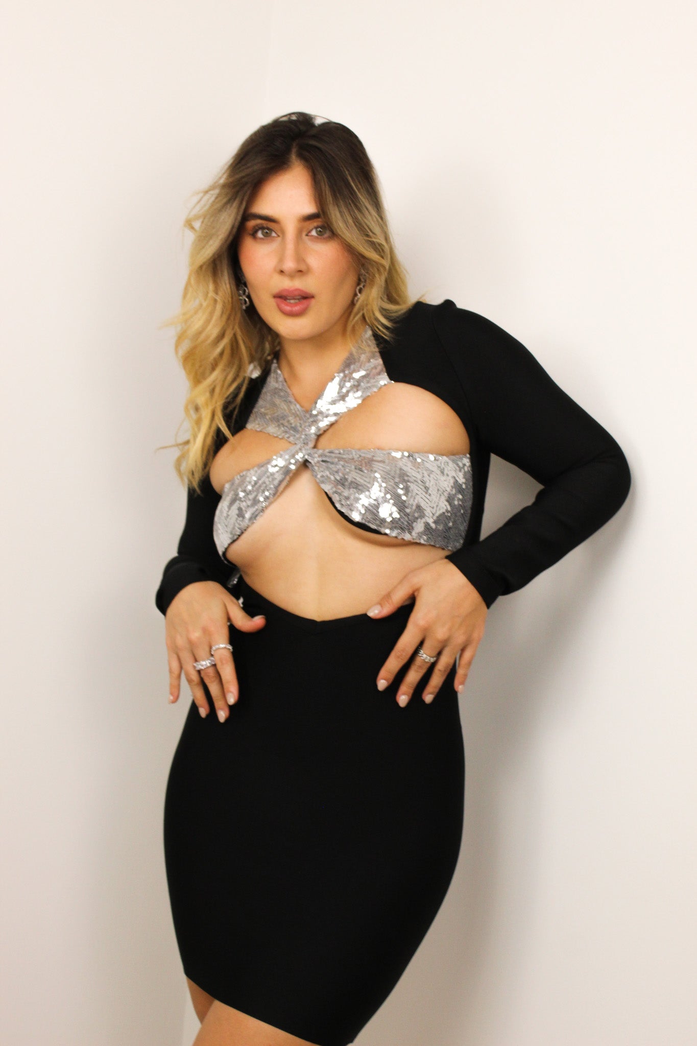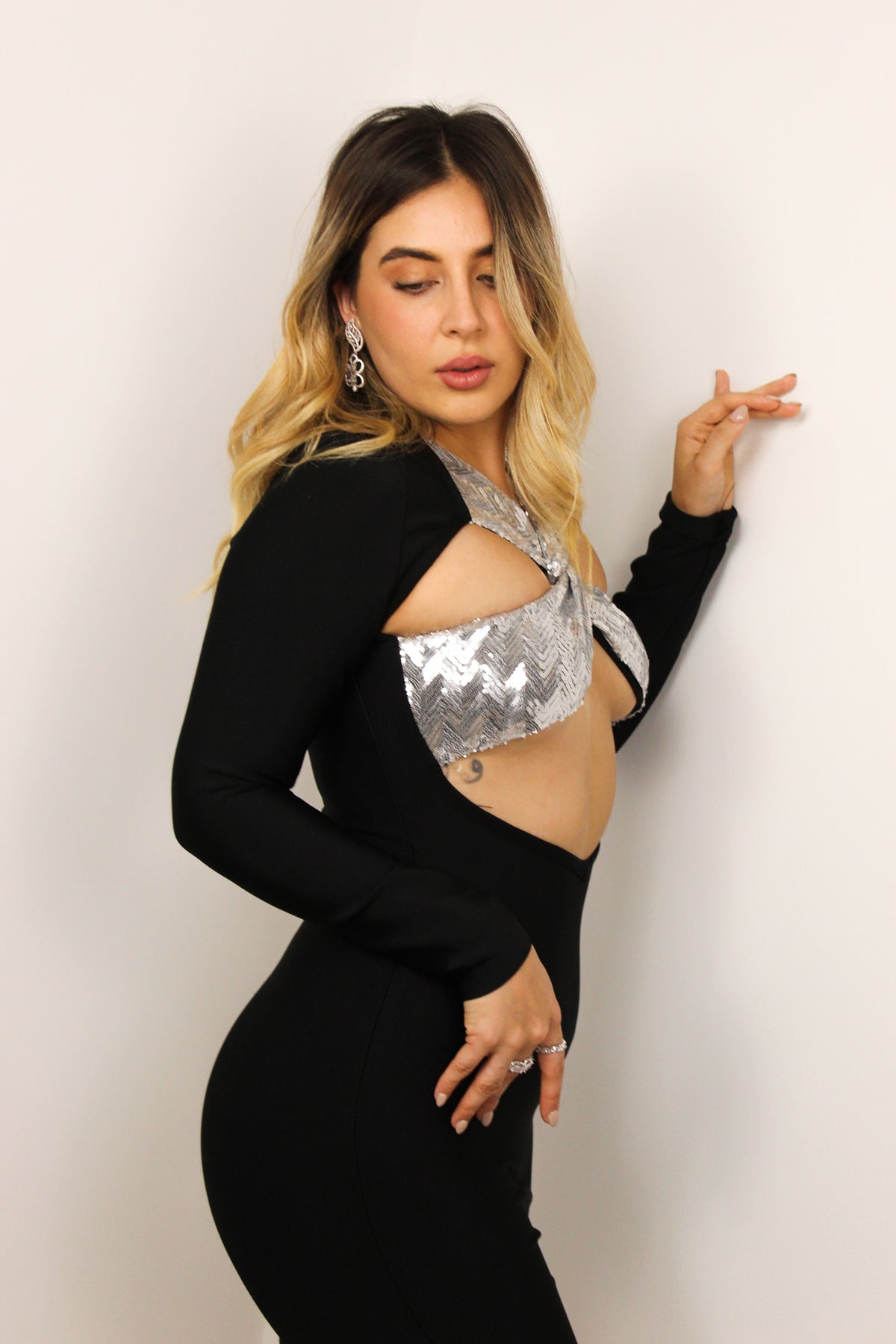 Vestido stretch super sexy ! color negro con detalle cruzado plateado en pecho .