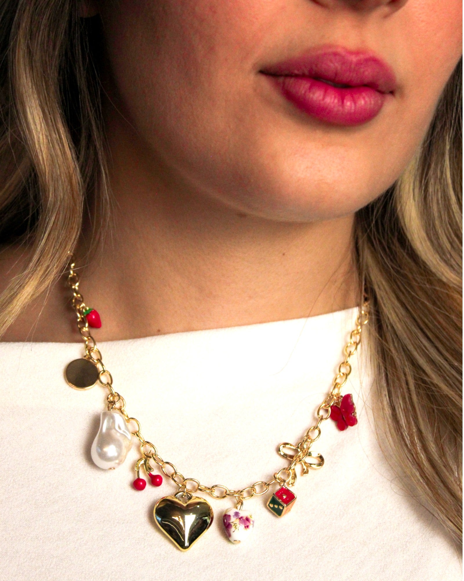 ¡Luce a la moda con estas cadenas dijes luck! Esta cadena dorada cuenta con dijes de corazón, cereza, perla y dado, ¡para que elijas el que más te represente!