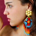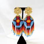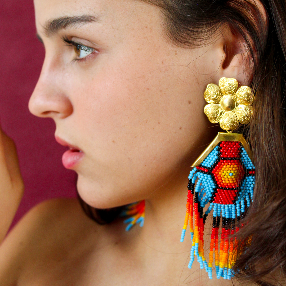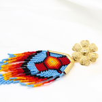 Aretes de flor dorada con trabajo huichol en chaquira tejida a mano en tonos rojizos , azules y naranjas.