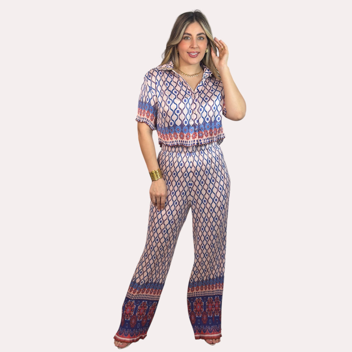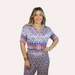 ¡Sé única con el conjunto Amanda! Blusa de botones y pantalón elástico con un estampado floral en tonos azul, lila y rojo.
