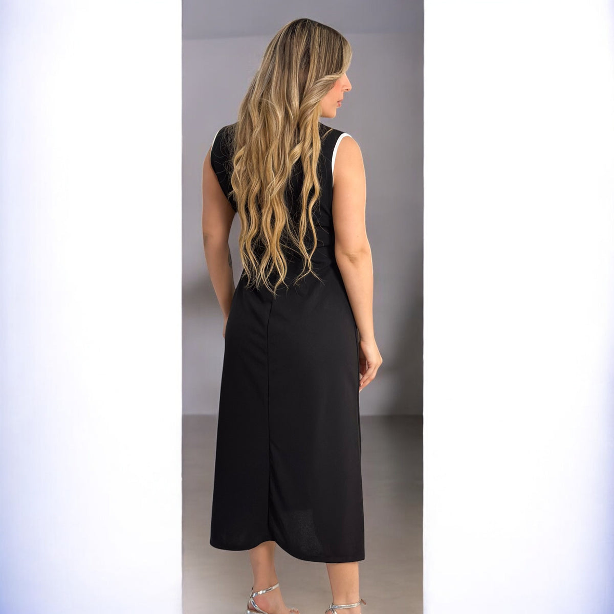 ¡Consigue un look elegante y cómodo con nuestro hermoso vestido midi! En color negro con una línea blanca y botones dorados, este vestido será tu favorito para cualquier ocasión.