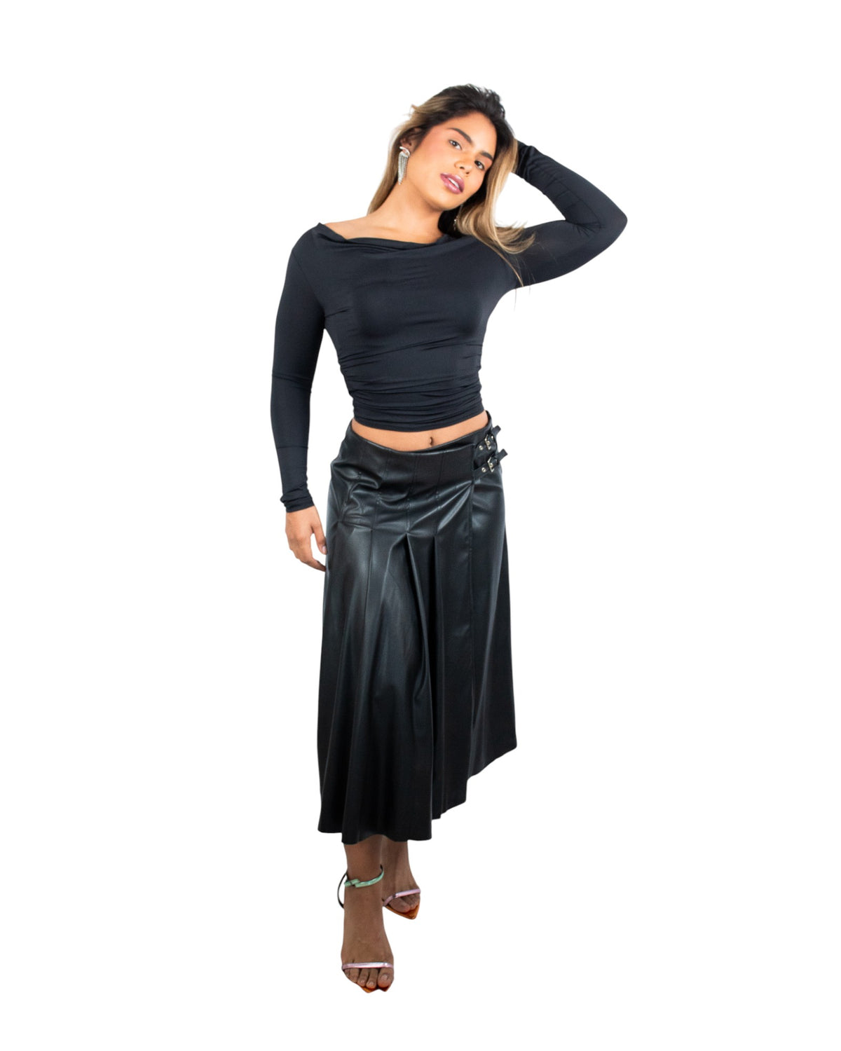 Este midi en cuero es tu nuevo secreto para verse increíble sin esfuerzo. Las hebillas plateadas en la cintura le dan ese toque de "wow" que transforma un look ordinario en algo extraordinario.