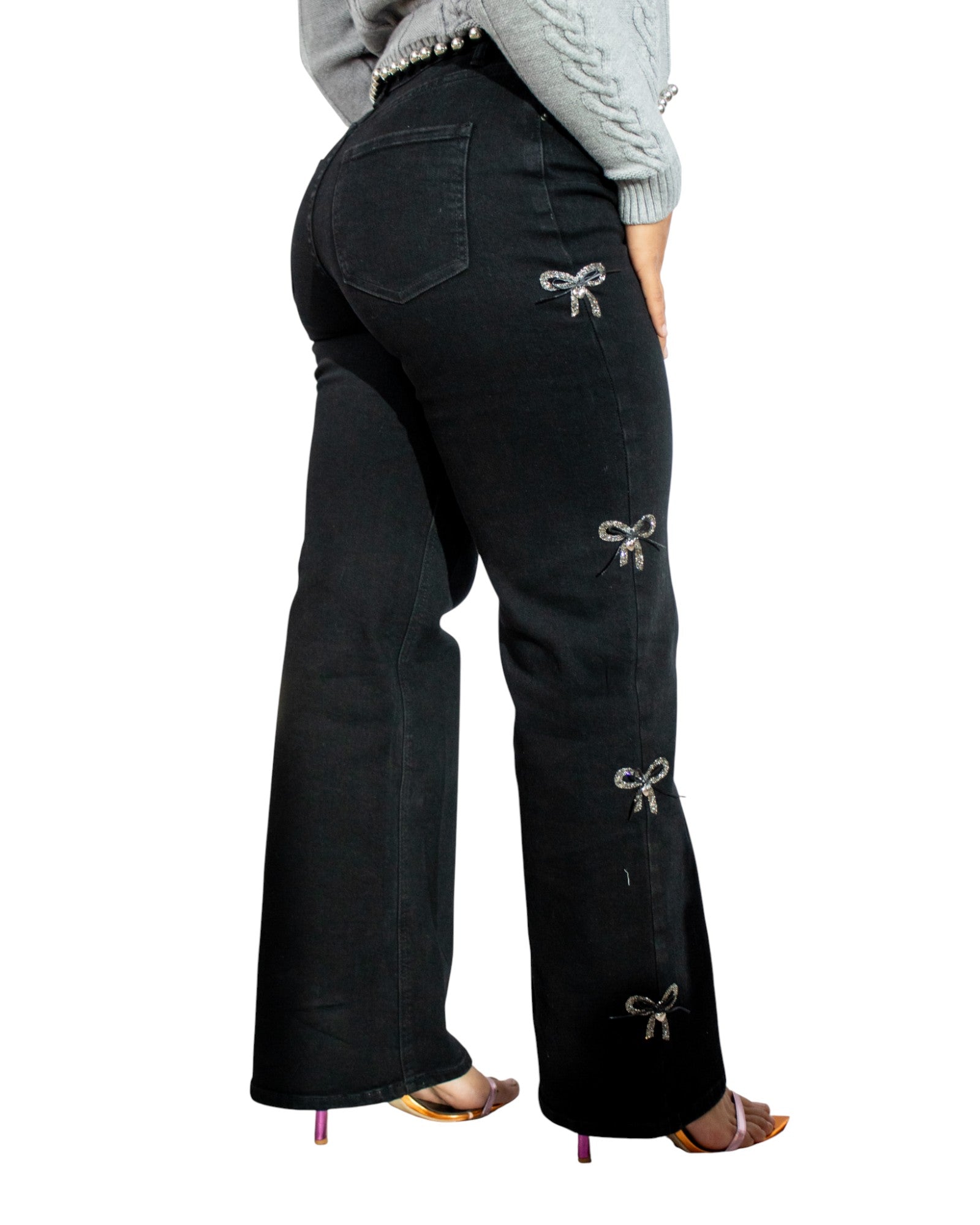Jeans Sasha: tu aliado perfecto para un look chic y divertido. Estos jeans negros de cintura alta abrazan tu figura de manera favorecedora, mientras que los adorables moñitos brillosos en los laterales de la pierna añaden ese toque cute que te hace destacar.