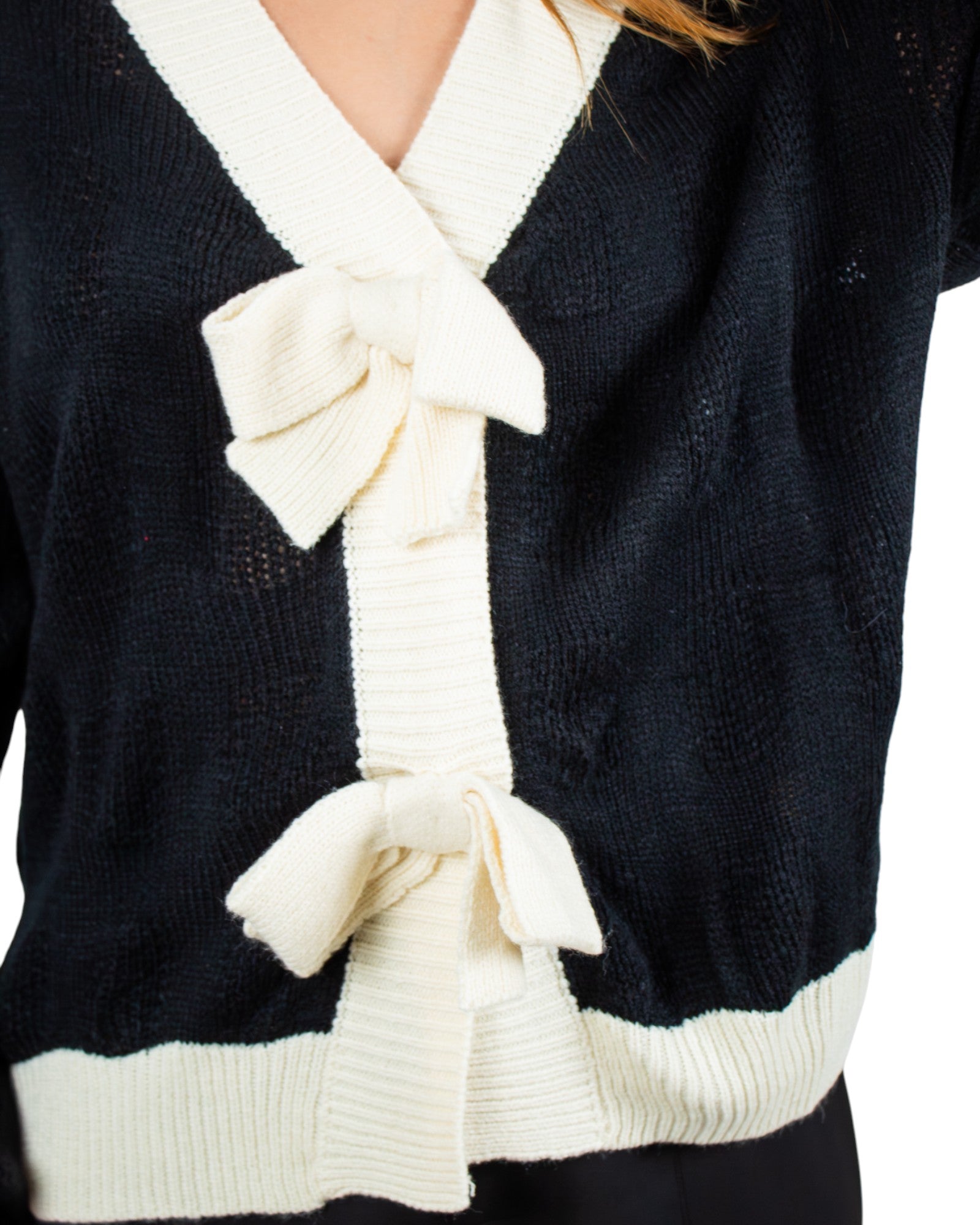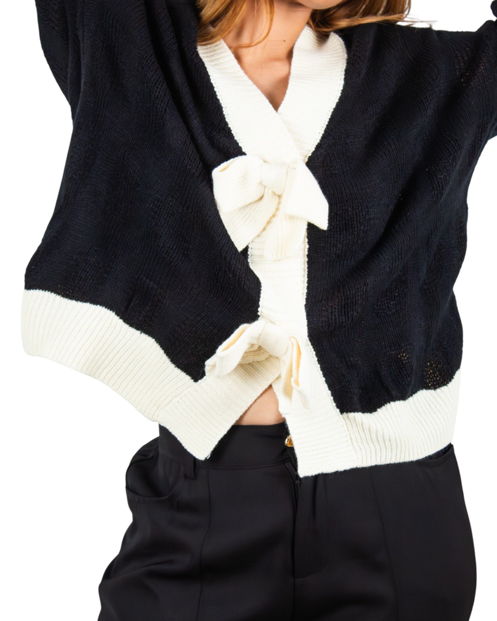 Este tejido negro suave envuelve tu cuerpo como un abrazo cálido, mientras los detalles de moño blanco le dan un toque de elegancia juguetona. Perfecto para esos días cuando quieres verte impecable sin sacrificar la comodidad.