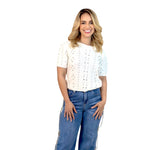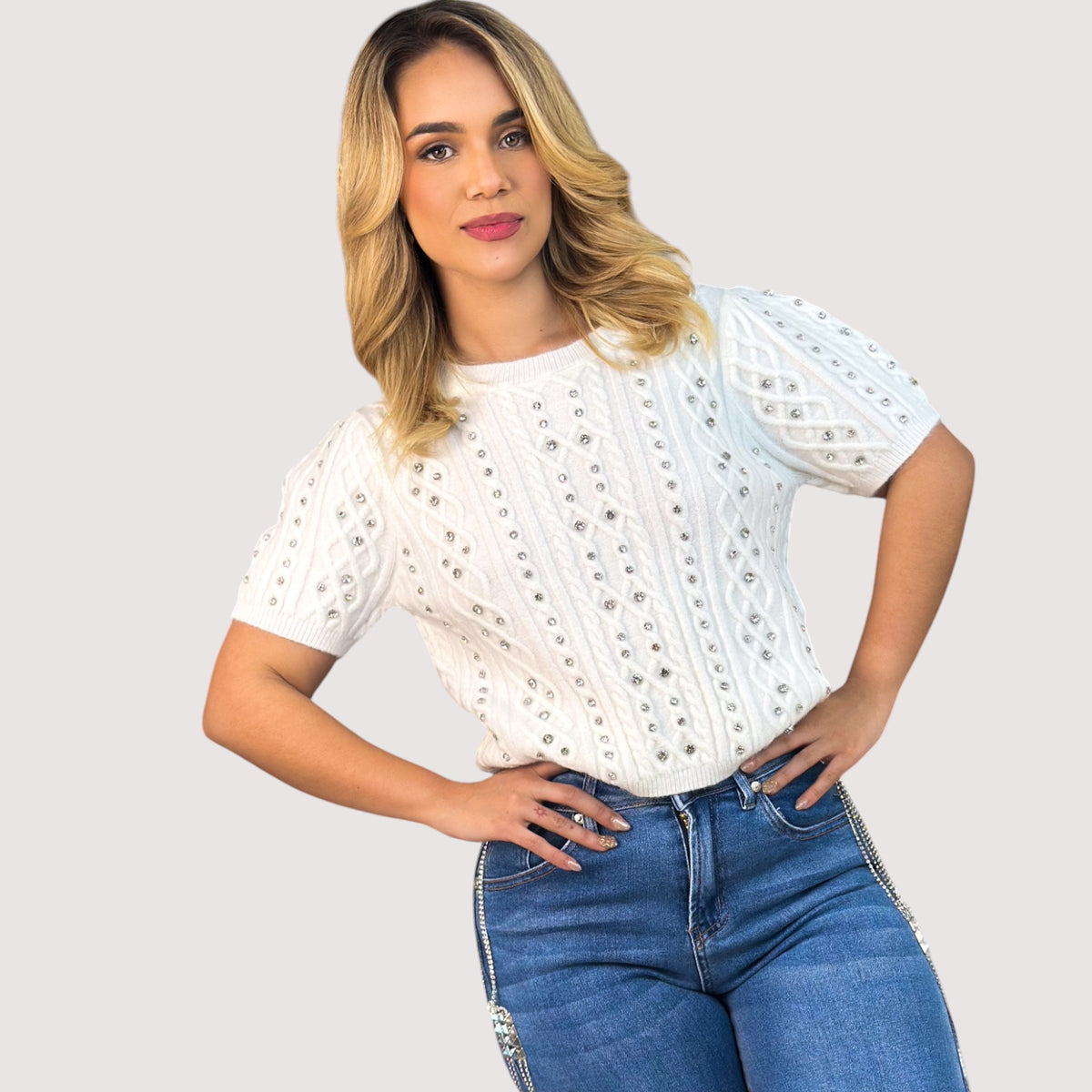 Super lindo y suave suéter de manga corta con aplicaciones de cristal plateado !