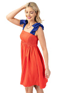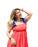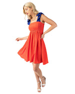 Vestido corto naranja vibrante con lazos de tirante en color Azul Marino ! Super lindo y fresco !