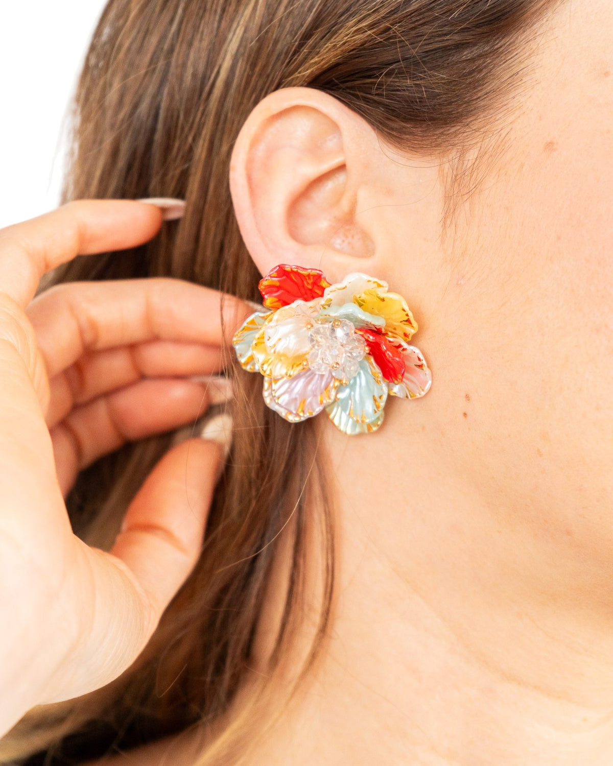 Arete de flor con pétalos en tonos arcoíris que capturan la luz de manera única. Cada pétalo presenta un degradado suave que transita entre colores vibrantes, creando un efecto visual cautivador. Los bordes dorados enmarcan delicadamente el diseño floral, añadiendo elegancia y sofisticación al accesorio. Perfecto para quienes buscan una pieza versátil que combine color y estilo. El acabado dorado complementa cualquier tono de piel y se adapta tanto a looks casuales como a ocasiones especiales. Un accesorio que expresa personalidad y creatividad.