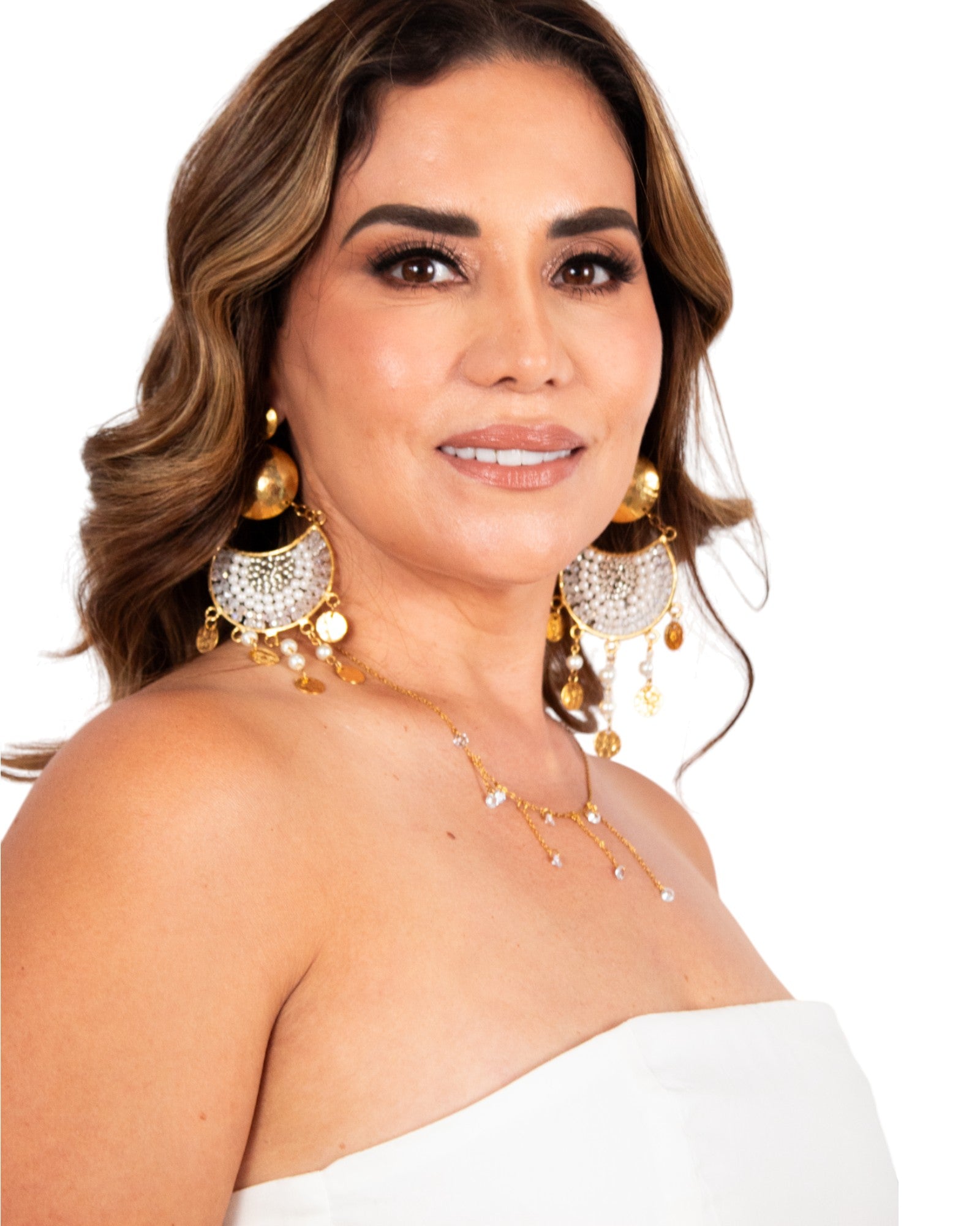 ¡Ilumina tu look con los aretes Aria! Estos hermosos aretes de diseño colombiano en color dorado son perfectos para cualquier ocasión.