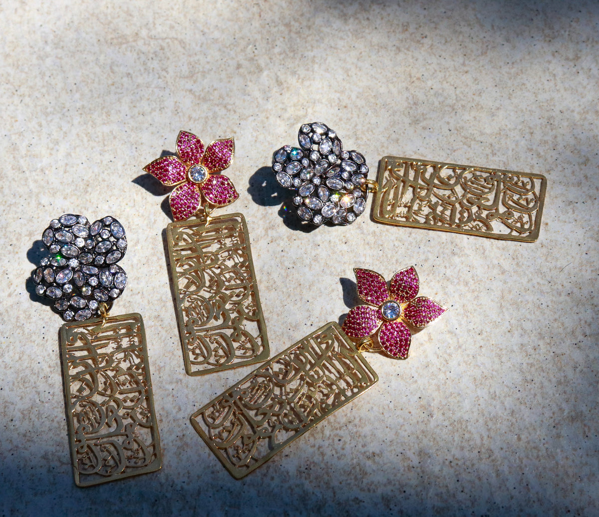 Aretes originales de Turquía hechos a mano en flor de zirconia con dije rectangular en escritura de símbolos dorados .