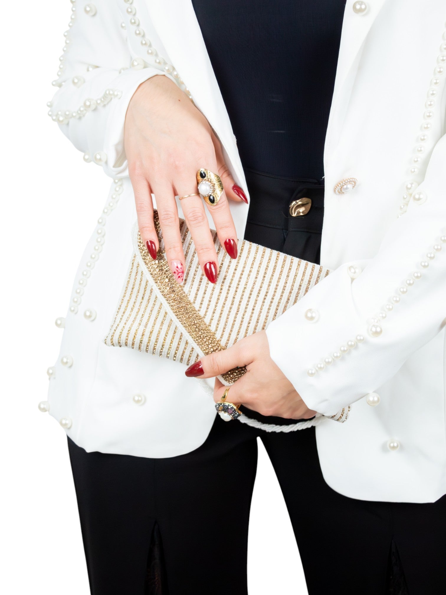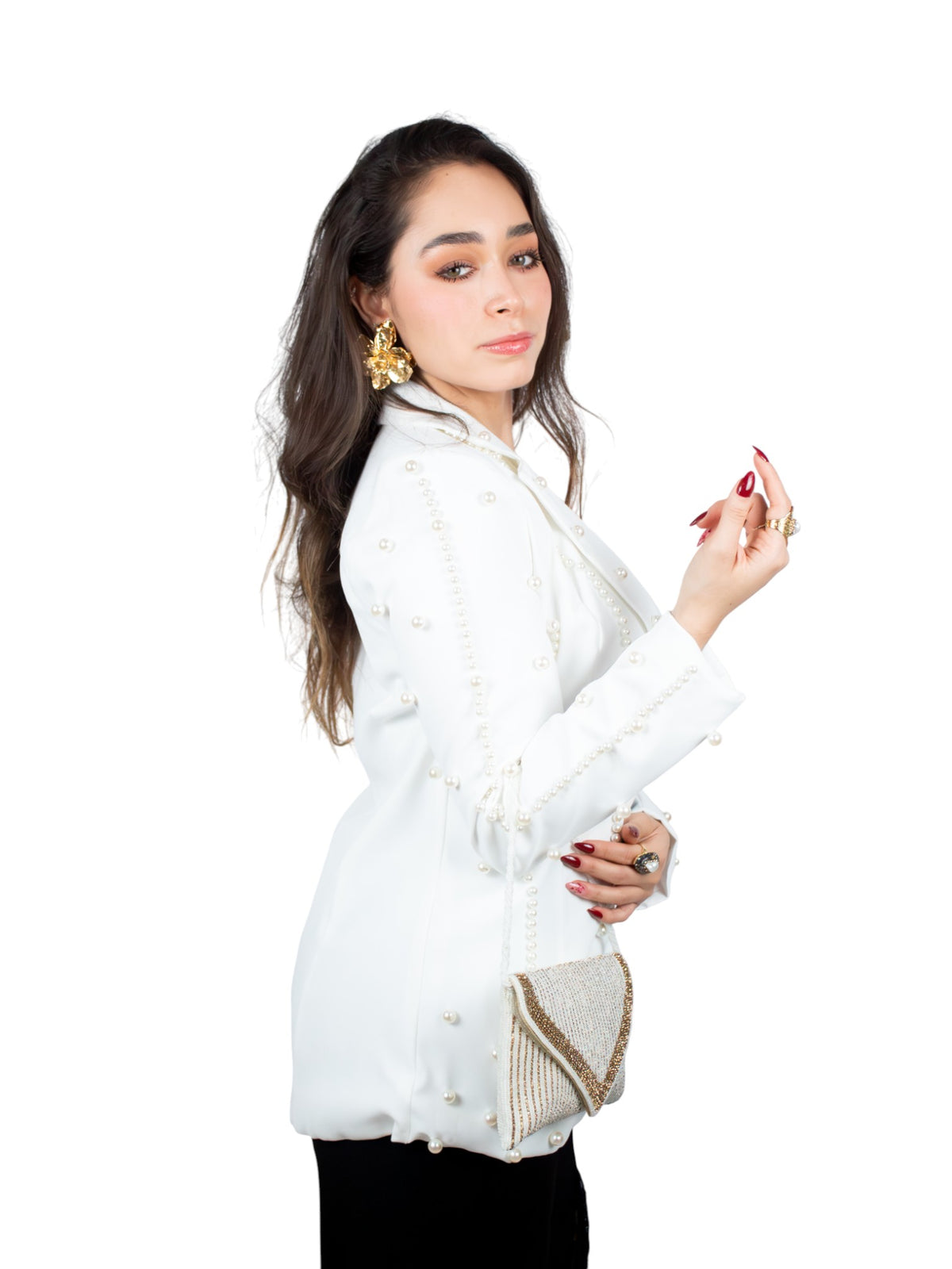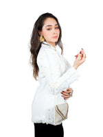 Blazer Gemma: tu aliado de elegancia con un toque de magia. Este diseño blanco impecable brilla con delicados detalles de perlitas que danzan sobre la tela, mientras que los botones dorados añaden un lujo sutil y sofisticado.