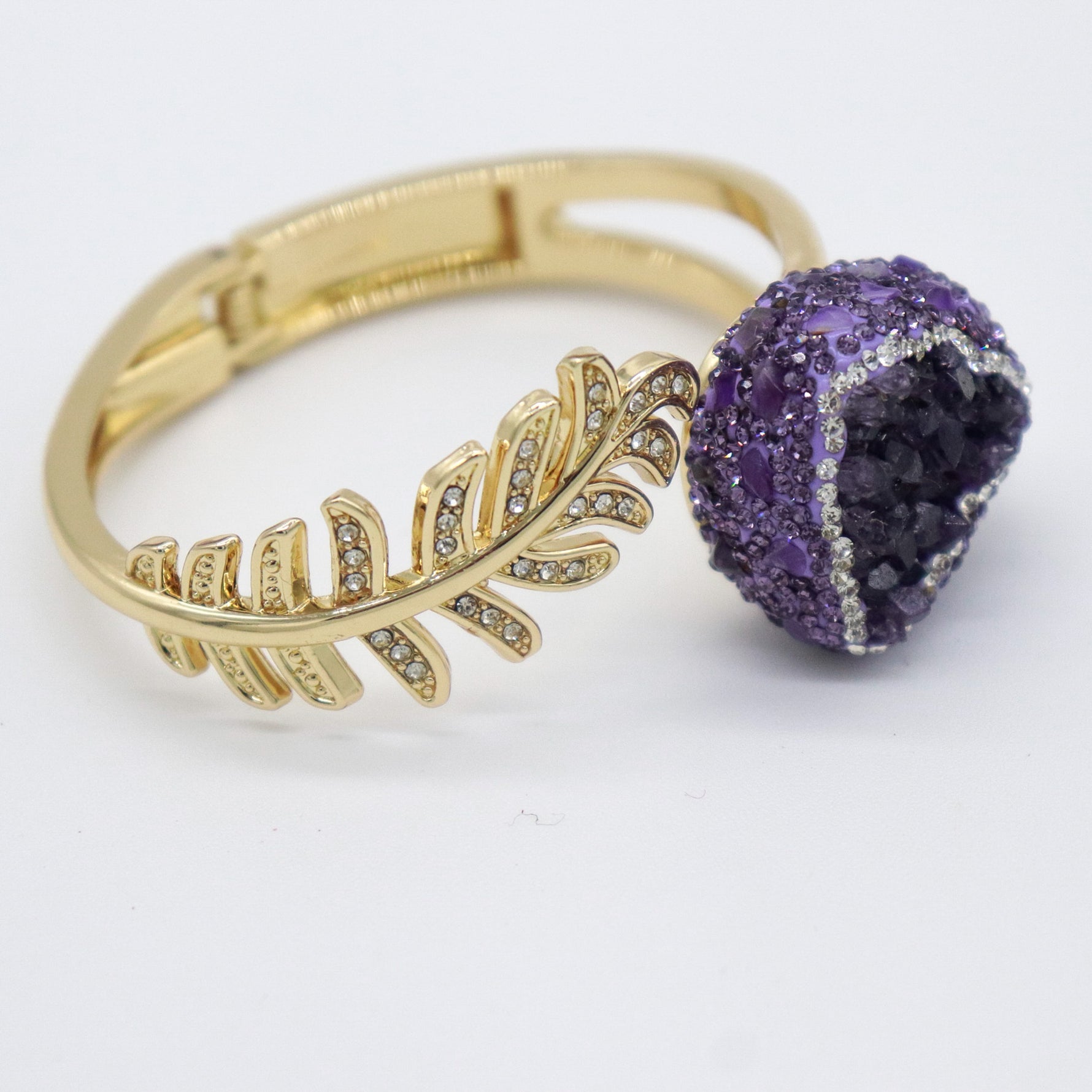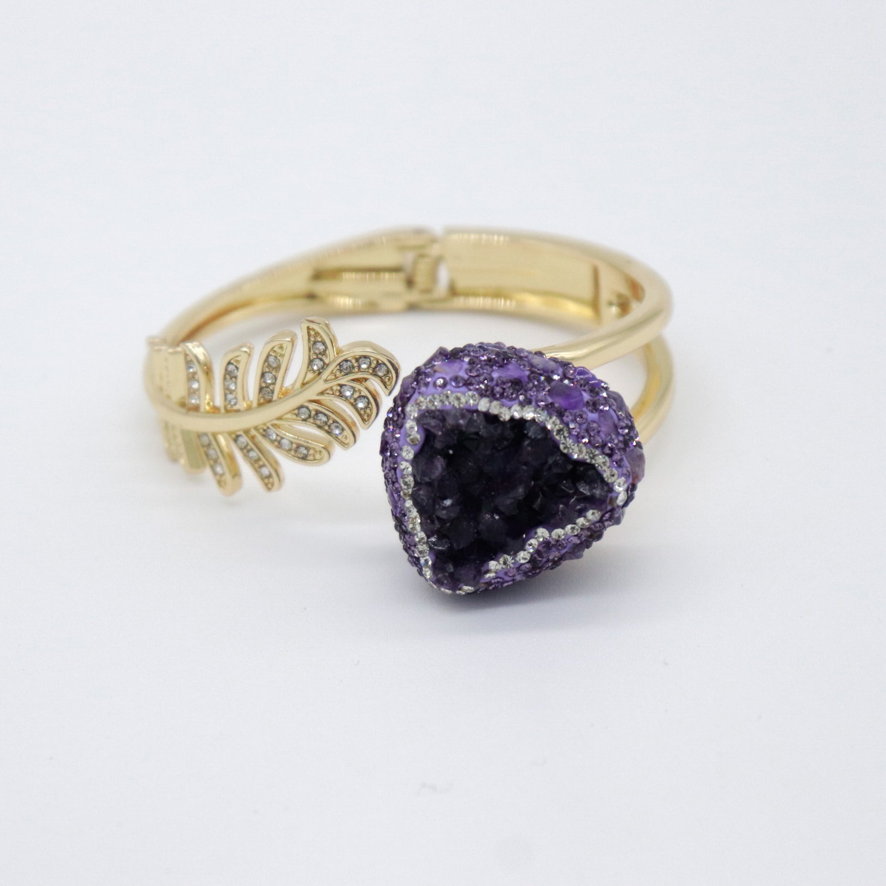 ¡Luce elegante y natural con nuestro brazalete dorado de hojas y zirconias! Ajustable para un ajuste perfecto, cuenta con una piedra de druzy de cuarzo con brillantes para añadir un toque de chispa.